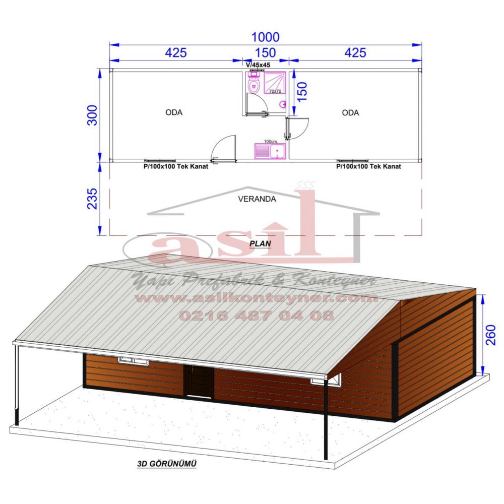 300x1000 (30 m²) İKİ ODA, WC, DUŞ, MUTFAKLI, V ÇATI + 235 cm. VERANDALI HAZIR EV.