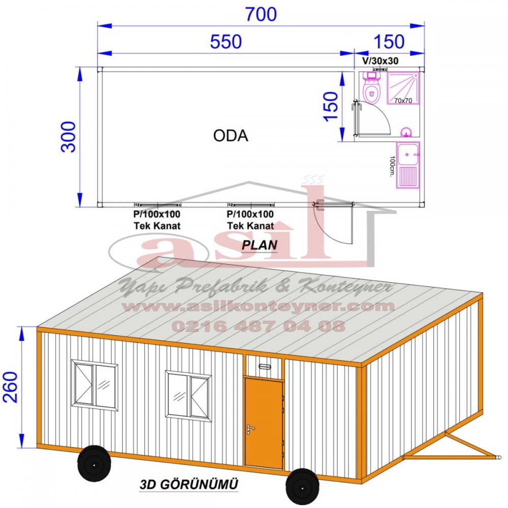 300x700 (21 m²) TEK ODA, WC, DUŞ, MUTFAKLI TEKERLEKLİ EV.
